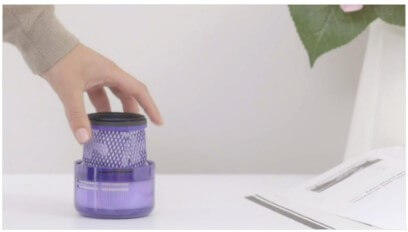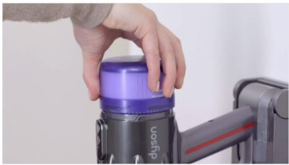 | 1. 전원 끄기 무선 청소기를 충전 거치대에서 분리한 다음, 필터를 시계 방향으로 돌려서 본체에서 분리합니다. |