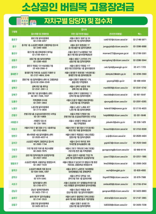 - 신청 장소 및 접수 방법 : 기업체 소재 자치구(접수처) 현장, 이메일, 우편, FAX