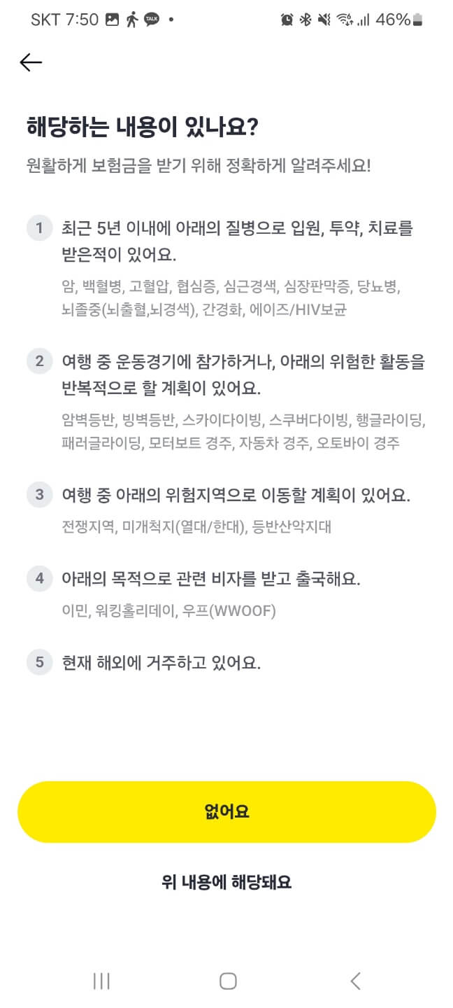 | 1. 해당 내용이 있다면 '해당번호 선택' 없다면 '없어요'를 선택하세요 | 2. 함께 가는 여행자의 보험 가입 동의를 기다리거나 요청 합니다. | 3. 함께 가는 여행자가 미동의시 혼자 가입 할수 있습니다. |
