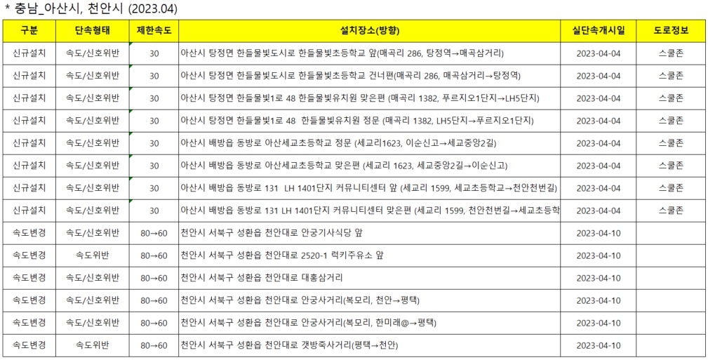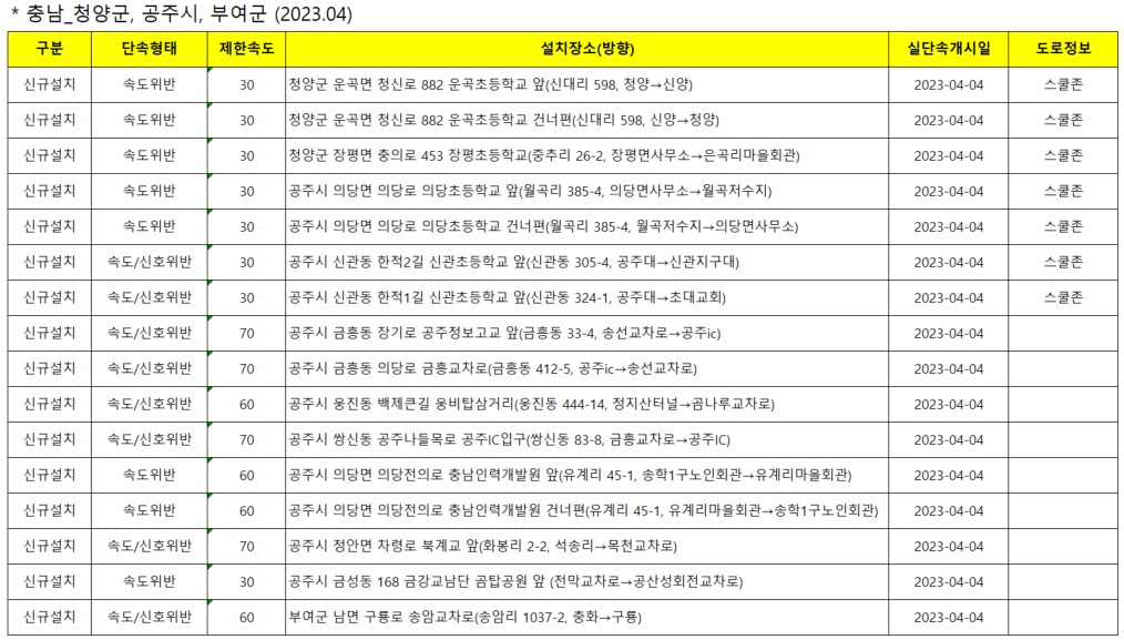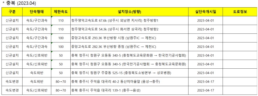 ▣ 2023년 4월 충북·충남 신규 과속 단속 카메라 설치 장소